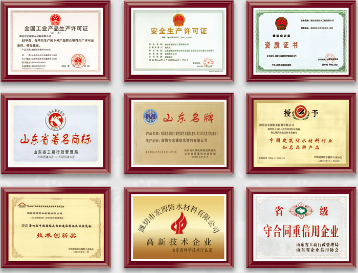 公司通过了ISO9001质量管理体系认证、ISO14001环境管理体系认证、ISO1800职业健康安全管理体系认证、环境标志产品认证和CRCC认证。其研发中心人才聚集,实力雄厚,成果丰硕,获得了多项专利成果并拥有自主知识产权,确保了设备、工艺及产品的先进性。公司具有国家二级建筑防水施工资质,可对外承接各类大型防水工程,并可提供专业技术服务。公司拥有自营进出口权,是首批“产品质量国家免检企业”,“宏源”商标被认定为“中国驰名商标”,并连续获得多项国家级荣誉称号。除潍坊基地外,公司在四川成都,江苏常州,吉林公主岭还设有生产基地。产品畅销全国各地,并出口到多个国家和地区。
