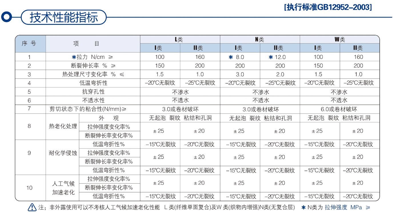 * N1 — 无复合层外露型防水材料                    * L2 — 纤维单面复合非外露型防水材料