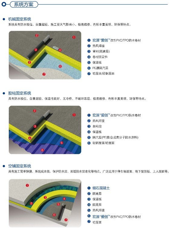 宏源聚氯乙烯(简称PVC)系列防水卷材,是以聚氯乙烯树脂为原料,掺加增塑剂、填充剂、抗氧剂、紫外线吸收剂与其他助剂等加工而成的新型高分子防水卷材。